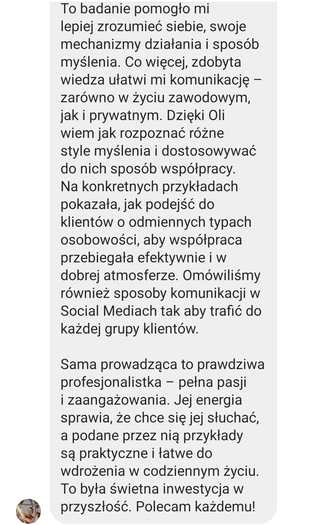 Jestem psychologiem, trenerem rozwoju i Certyfikowanym Trenerem FRIS® – metodologii badającej Style Myślenia. Na co dzień inspiruję innych do proaktywnej pracy nad własną marką i odkrywania swoich talentów i predyspozycji.
